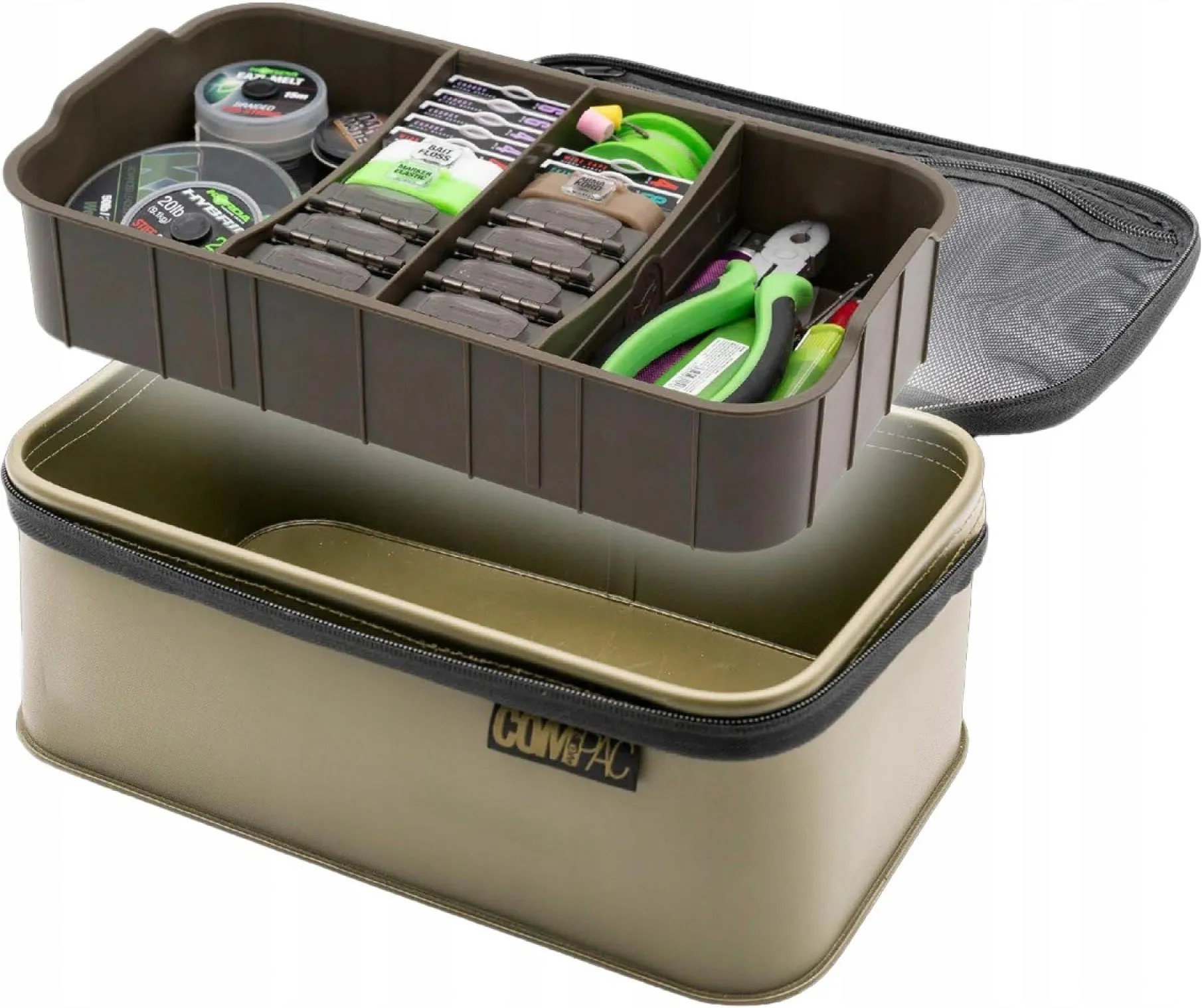 Korda Compac Organizer este o geanta semirigida fabricata din EVA impermeabil si durabil, recomandata pentru depozitarea diferitelor accesorii de pescuit, monturi, echipamente. Materialul ajuta geanta sa isi pastreze forma initiala chiar si cand aceasta este goala. Capacul de inchidere negru-mat lucios are imprimat logo-ul Korda, pentru a atesta calitatea si originalitatea produsului.